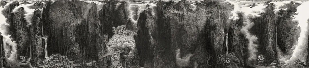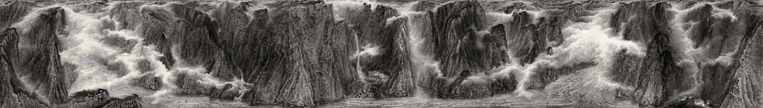 Lai's "real state" presents a kind of majestic beauty. In his large-scale works more than ten meters long, there are mountains stretching and clouds and fog rushing. The orderly brush and ink language contains a gushing wild power, conveying an irresistible inner impulse. Like the Qiantang River tide, they are whizzing across the river bank, colliding with waves of passion. This is a "real state", and Lai hopes to pursue a thick, steady, and powerful beauty through these images. In his "real state" works, Lai borrowed the panoramic views of the landscape paintings of the Northern Song Dynasty, but he did not adopt the characteristics of the natural scenery being close to people, but filled the picture with a religious and mysterious atmosphere. Such mysterious atmosphere comes from the serene consciousness he endows the painted objects and the corresponding artistic treatment. The steep mountains and cliffs constructed by the dense, complicated and hard ink lines did not leave the viewer with the spatial possibility that the landscape paintings of the Northern Song Dynasty emphasized, that is, they can be seen, stepped on, traveled, and lived in. Instead, Lai's sparsely vegetated cliffs constitute only a vast image. The turbulence of clouds in the mountains and valleys does not create a three-dimensional space for the viewer to travel; it just constitutes a formal interest in the conflict between motion and rest. In Lai's vision, the viewers should feel that they are not looking at the painting, but standing at the foot of the cliff and staring at the nature, until the hustle and bustle of the world disappears, leaving only the roar of the waterfall and the ethereal sound of the clouds