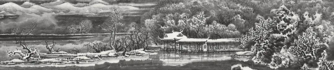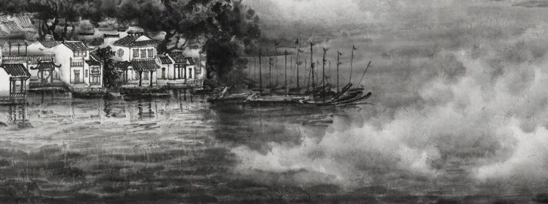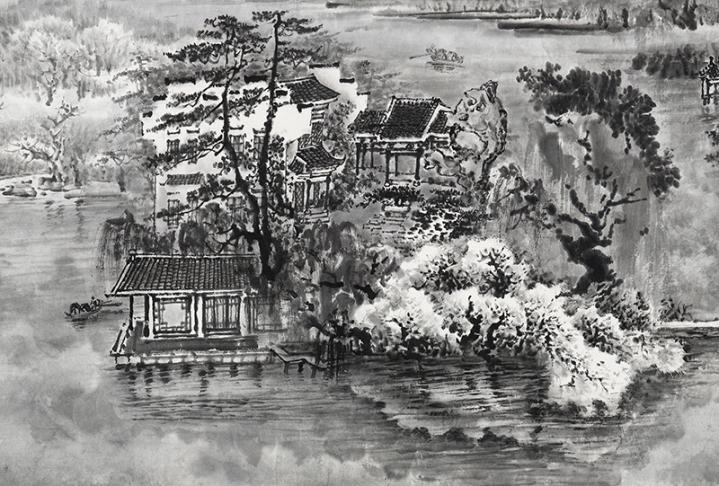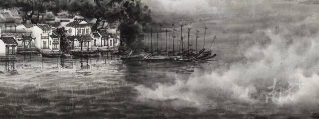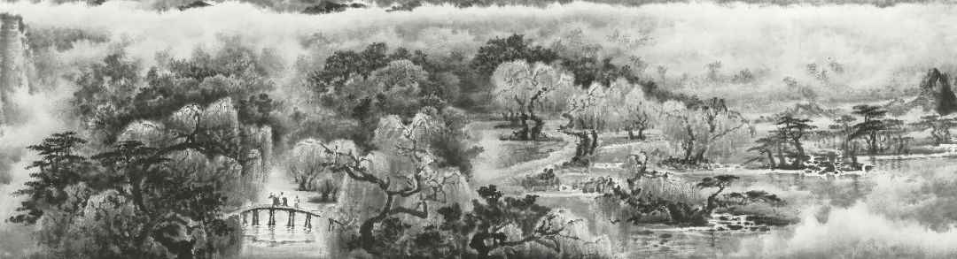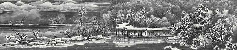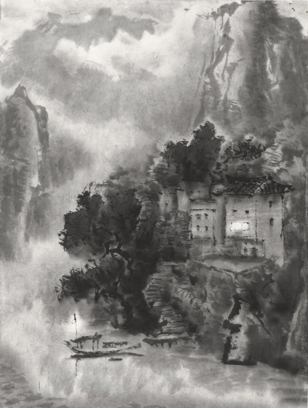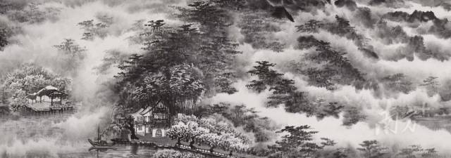 The ink shapes poured on the paper are all centered around the smoke, clouds and rays of the accumulated ink method. Mountains, rivers, bridges, pavilions, vegetation, snowy, moon, people, and boats are all dense and well-arranged. With bright and dark, cold and warm, and freshness and strangeness embracing each other, both the form and rhythm are advancing step by step