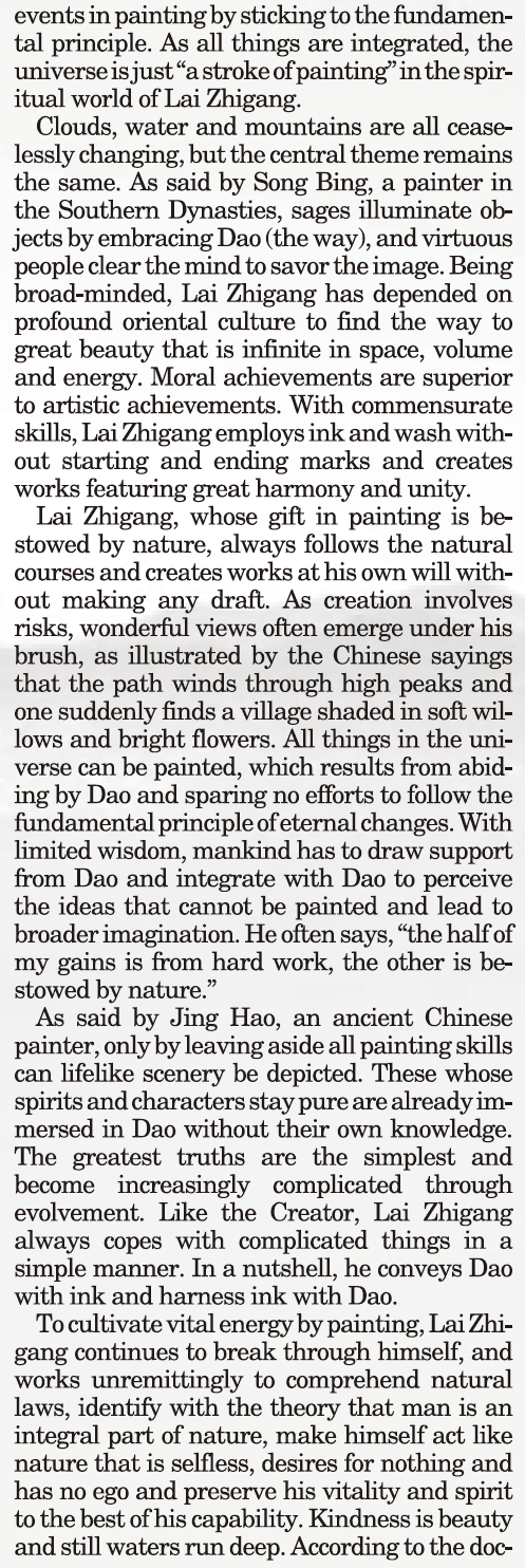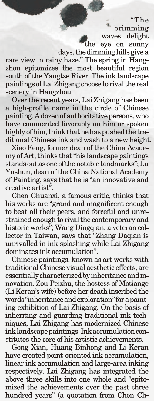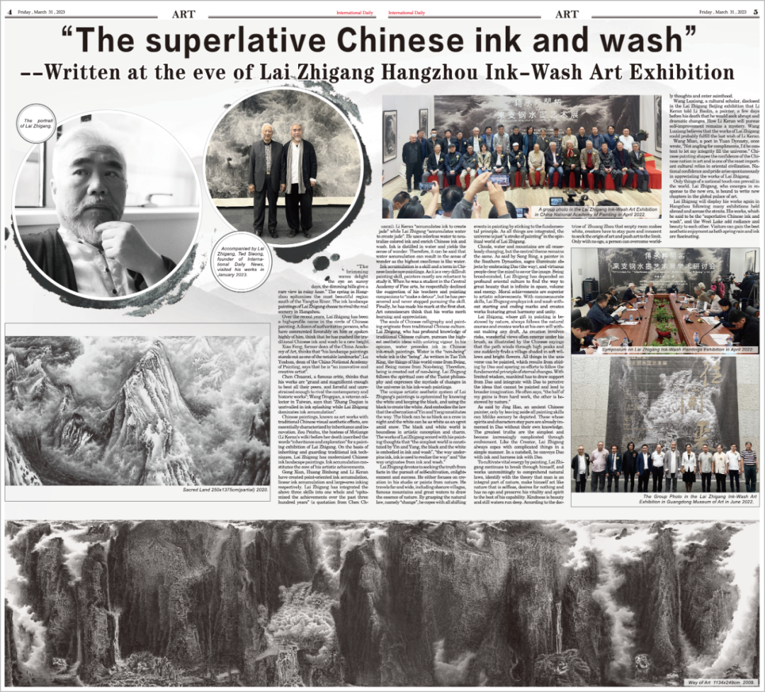 [News] Before the "Pioneer of the Times" - Exhibition of Lai Zhigang’s Ink Art was held in Hangzhou on April 6, the mainstream American media Los Angeles Times published a review article "The Superlative Chinese Ink and Wash – Written at the eve of Lai Zhigang Hangzhou Ink – Wash Art Exhibition" in the paper media on March 31 in the form of a cross-page special edition, which aroused widespread attention and interest from local readers. Industry insiders commented that Lai has brought Chinese ink painting to the world.